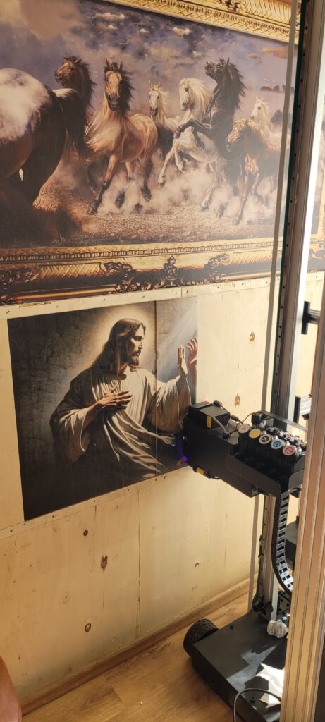 Pracujemy w technologii druku UV wall printing o wysokiej rozdzielczości do 1440 dpi, z wykorzystaniem atramentu utwardzanego światłem UV. System umożliwia druk w kolorach CMYK + biały, odwzorowanie detali oraz realizację grafiki na ścianach o wysokości do 375 cm i praktycznie nieograniczonej szerokości. Technologia pozwala także kompensować nierówności podłoża do ±5 cm, co przekłada się na estetyczny i precyzyjny efekt końcowy.